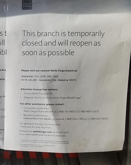 SYLACAUGA, Ala. – Sylacauga’s Wells Fargo branch is closed, for now.