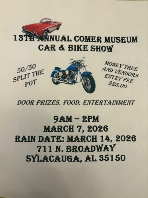 The 13th Annual Comer Museum Car and Bike Show is Saturday March 7, 2026, 9:00 a.m. – 2:00 p.m. at the museum. Besides all the cars and bikes on display, there will be food, entertainment, 50/50 split the pot, money tree, door prizes and vendors. The entry fee for vehicles is $25.00.