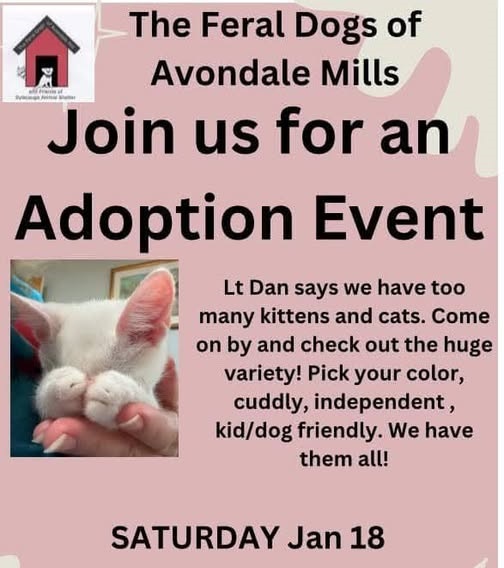 Saturday January 18, 2025, Feral Dogs of Avondale Mills will be holding an Adoption Event at 125 Marble City Heights Road from 10:00 a.m. – 2:00 p.m. Adoption fee is $80 cash or check only.