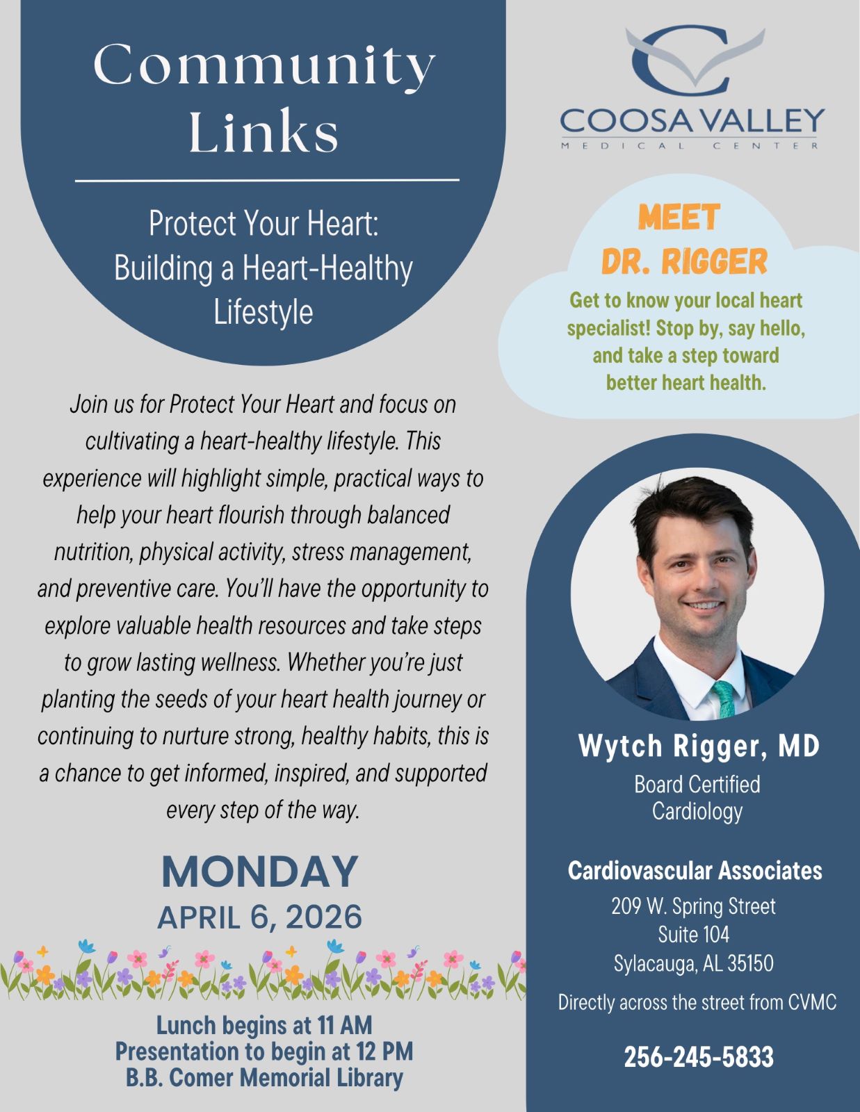Coosa Valley Medical Center is excited to invite you to the next Community Links, held on Monday, April 6, 2026 at the B. B. Comer Memorial Library. Protect Your Heart is an inspiring experience designed to help you take control of your heart health and feel your best. Discover simple, practical ways to strengthen your heart through balanced nutrition, movement, stress management, and preventive care. Connect with valuable resources, gain expert insights, and leave with tools you can start using right away. Whether you’re just getting started or looking to elevate your wellness routine, this is your opportunity to invest in a healthier, stronger you, every step of the way. Lunch begins at 11:00 a.m. and the presentation begins at Noon.