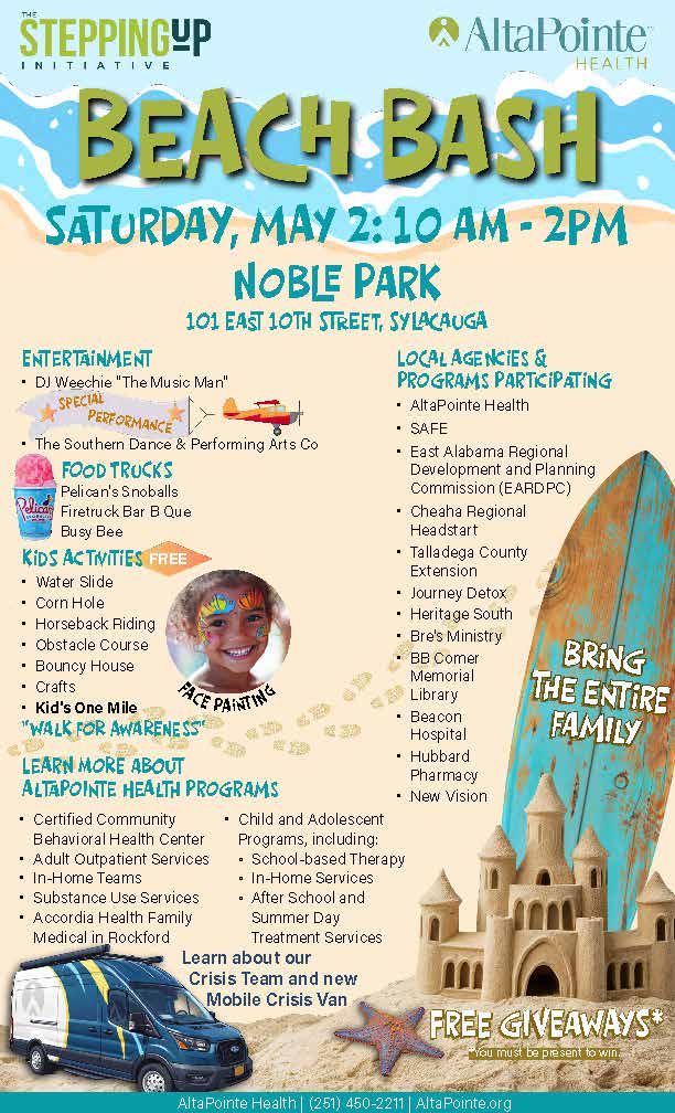 Altapointe Health is steppin’ up for mental health with a Beach Bash May 2, 2026 at Noble Park 10:00 a.m. – 2:00 p.m. Bring the entire family! They’ll have activities for the kids like a water slide, corn hole, horseback riding, an obstacle course, bounce house and crafts. Plus there will be food trucks there and live music. Then mom and dad can find out about all the programs Altapointe Health has to offer.
