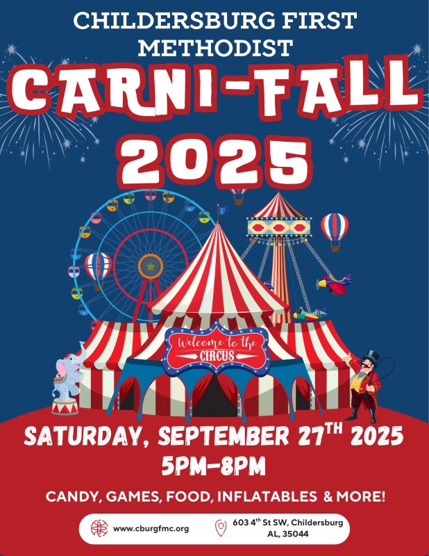 Childersburg First Methodist Church is having a Carni-Fall Saturday, September 27, 2025, 5-8pm, with candy, games, food, inflatables and more!