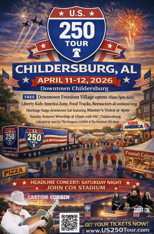 The US 250 Tour will make a stop in Childersburg April 11-12, 2026 and they’re celebrating! Downtown Freedom Village will open at 10:00 a.m. both days. There will be a Liberty Kids America Zone, food trucks and re-enactors all weekend long. There will also be some great live music including The Masters and Easton Corbin! Sunday you can worship with FBC Childersburg at 10:00 a.m. and then at 1, the live music continues with The Hoppers and Griffish. The event concludes with the Freedom 250 show! This is a once in a lifetime event you won’t want to miss!