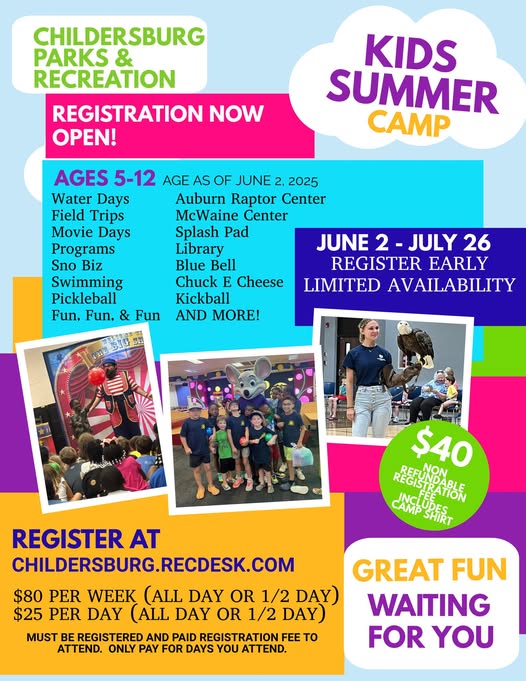 Childersburg Parks and Recreation is registering kids for their Summer Camp that will be June 2 – July 26, 2025. The cost is $80/week or $25/day. There is also a $40 registration fee that includes a camp T-shirt. You can register at the Rec Center at 300 First Street or online at Childersburg.recdesk.com.