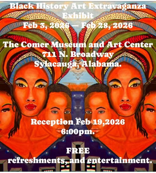 The February Exhibit at the Comer Museum is their Black History Art Extravaganza. There will also be a reception February 19, 2026 at 6:00 p.m. with free refreshments and entertainment.