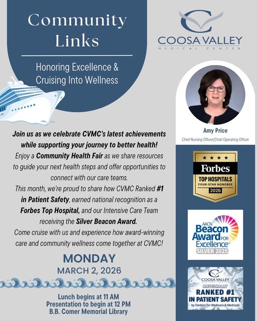 Join Coosa Valley Medical Center for their next Community Links on Monday, March 2, 2026 at the B. B. Comer Memorial Library Hightower Room. This month they’re hosting a Community Health Fair designed to empower your wellness journey with helpful resources, hands-on support, and opportunities to connect directly with our care teams. Lunch begins at 11am and the fair begins at Noon.