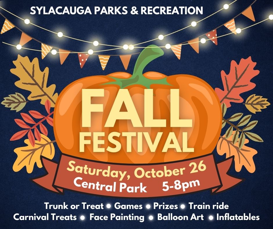 Sylacauga Parks and Recreation’s Fall Festival is October 26, 2024 at Central Park, 5:00 -8:00pm. There will be games, prizes, trunk-or-treat, a train ride, and more, and it’s all FREE! Kids are encouraged to wear their Halloween costumes.