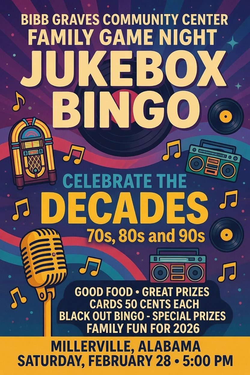 Come to the Bibb Graves Community Center Saturday February 28, 2026 at 5:00 p.m. to celebrate the songs of the 70s, 80s and 90s with Jukebox BINGO!  Cards are just 50 cents each. Good food, great prizes and a special prize for Blackout BINGO. It’s fun for the whole family!