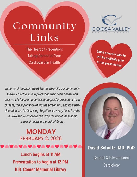 In honor of American Heart Month, you’re invited to take an active role in your heart health. Come hear Dr. David Schultz on Monday, February 2, 2026, at the B. B. Comer Memorial Library in the Hightower Room. Lunch begins at 11:00 a.m. and the presentation begins at Noon.
