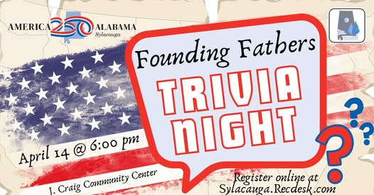 Sylacauga Parks and Recreation is hosting Founding Fathers Trivia Night April 14, 2026 at 6:00 p.m. at the J. Craig Smith Community Center. Whether you’re a history buff or just in it for the fun, there’s something for everyone. The evening will include multiple trivia rounds, a halftime break, and a final bonus round. Teams of up to four players will work together to answer questions, compete for bragging rights, and enjoy a lively, engaging atmosphere. Anyone is welcome to attend and observe,