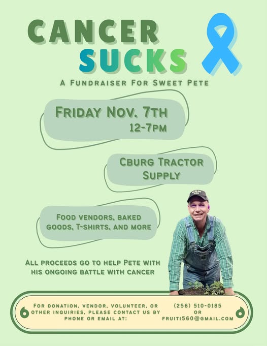 A fundraiser for “Sweet Pete” Baker of Four Mile Farms produce will be Friday, November 7, 2025, from Noon to 7:00 p.m. at Childersburg’s Tractor Supply parking lot, with food trucks, baked goods, T-shirts, and more.
