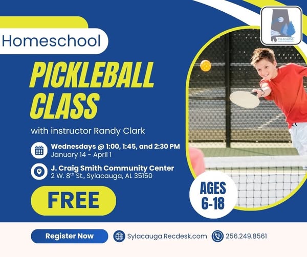 Randy Clark will be teaching another Homeschool Pickleball Class on Wednesdays beginning January 14, 2026 and going through April at the J. Craig Smith Community Center. This is for kids ages 6-18 years old, and it’s FREE! But you must register at sylacauga.recdesk.com or go by the J. Craig Smith Community Center during normal business hours.