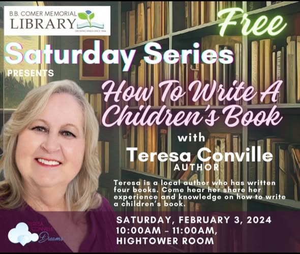 Learn how to write a children’s book with Teresa Conville Saturday, February 3, 2026, 10:00 a.m. in the Hightower Room.