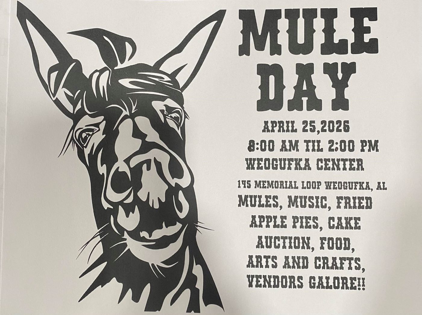 The Weogufka Center is holding their annual Mule Day Festival on Saturday, April 25h, from 8:00 a.m. to 2:00 p.m. with mules, music, arts and crafts vendors, and lots of delicious food.