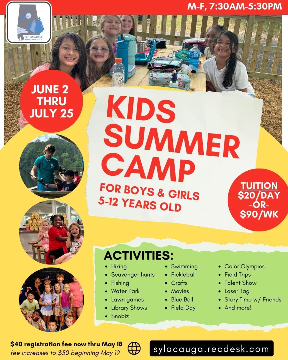 Sylacauga Parks and Recreation is registering kids for their Summer Camp that will be June 2 – July 5, 2025, Monday through Friday 8:30 a.m. – 5: 30 p.m. Tuition is $20/day or $90/week plus a $40 registration if registered before May 18, 2025. The registration fee goes up to $50 after May 18, 2025. Dozens of activities for your kids. Register at the J. Craig Smith Community Center or online at Sylacauga.recdesk.com.