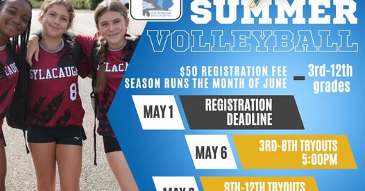 Sylacauga Parks and Recreation is taking registrations for Summer Volleyball until May 1, 2026 for girls in 3rd through 12th grades. Cost is $50. Sign up online at Sylacauga.recdesk.com or go by the J. Craig Smith Community Center during normal business hours.
