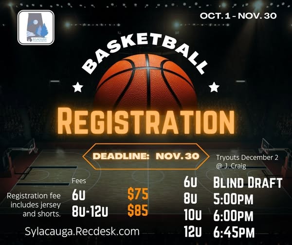 Sylacauga Parks and Recreation is registering kids ages 6-12 for basketball until November 30, 2025. Cost is $75 for 6U and $85 for all others. Register online at Sylacauga.recdesk.com or in person at the J. Craig Smith Community Center during normal business hours.
