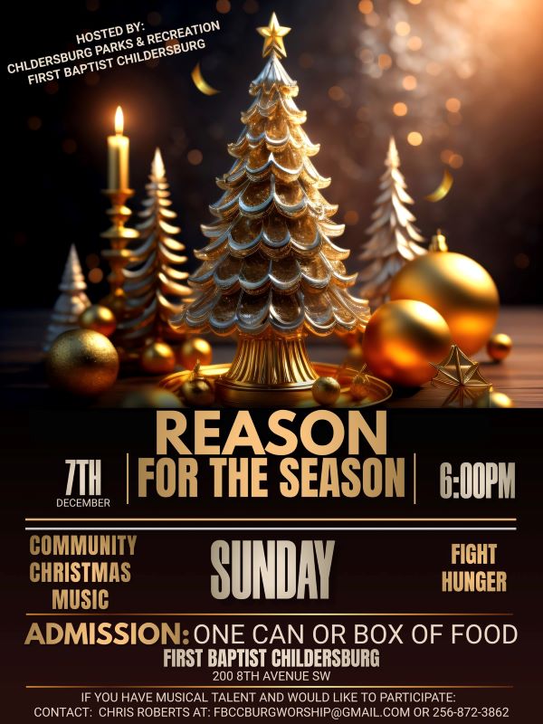 Make plans to attend The Reason for the Season community-wide musical Christmas Celebration December 7, 2025 at 6:00 p.m. at First Baptist Church of Childersburg. Admission is 1 can or box of food.