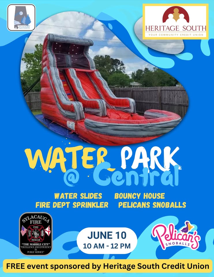 Get ready to beat the heat with a day full of summer fun! The Sylacauga Parks and Recreation Department is excited to announce Water Park @ Central, taking place on Tuesday, June 10, 2025 from 10:00 a.m. to 12:00 p.m. at Central Park . This FREE community event, proudly sponsored by Heritage South Credit Union.