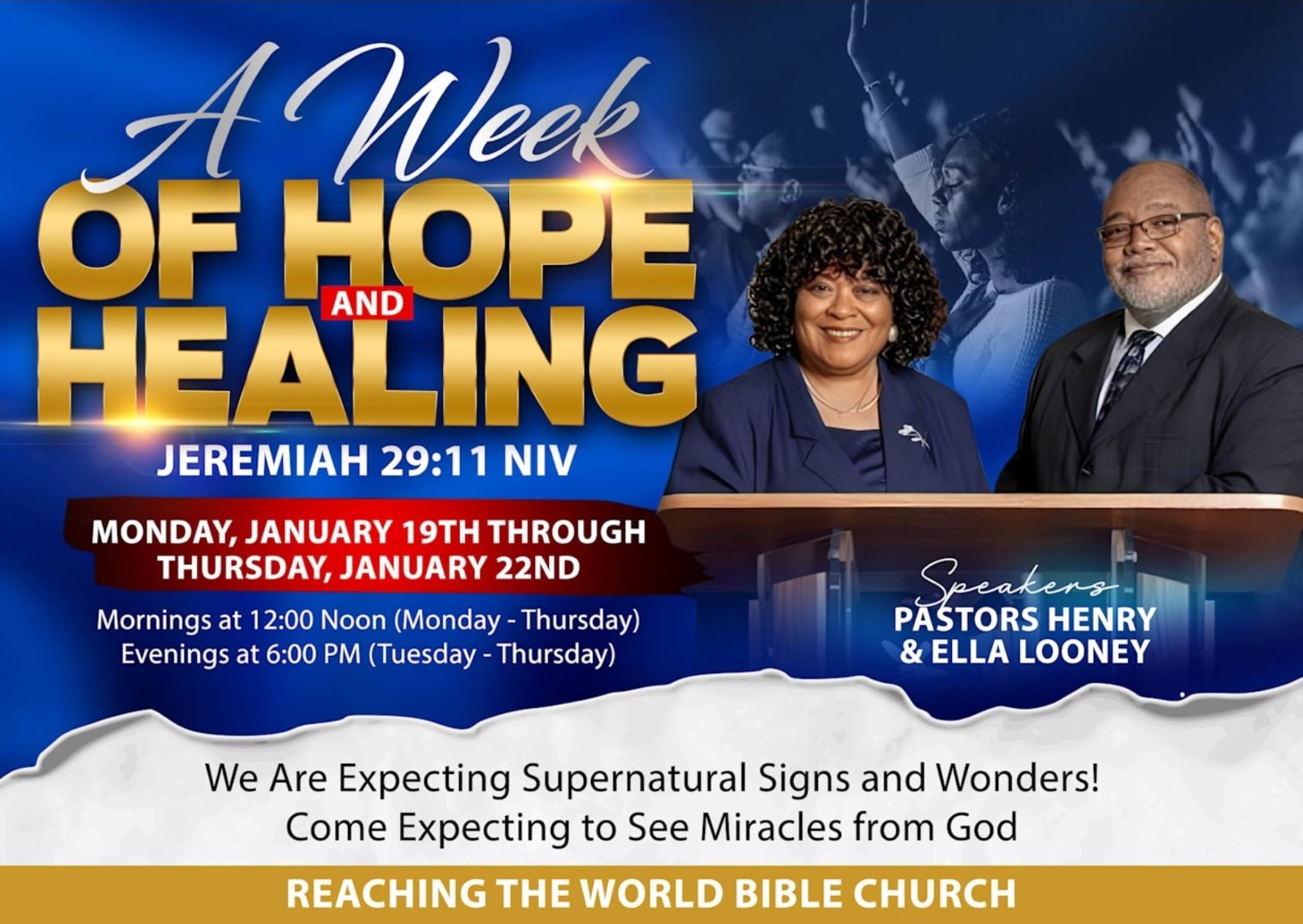 Reaching the World Bible Church is having a Week of Hope and Healing January 19-22, 2026. Monday – Thursday at Noon, and Tuesday – Thursday at 6:00 p.m. Come expecting to see miracles of God.