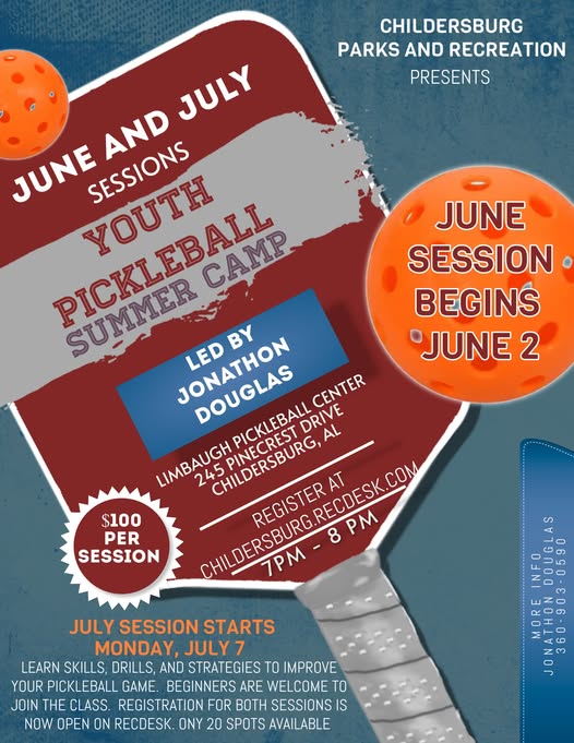 Childersburg Parks and Recreation is having 2 Pickleball Summer Camps beginning June 2, 2025 and July 7, 2025 led by Jonathan Douglas. Only 20 slots available per camp. Cost is $100/camp. Register online at Childersburg.recdesk.com.