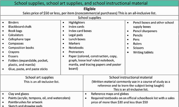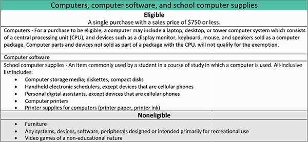 Here is a guide to what is eligible and what is not eligible for “Tax-Free” status during the three-day sales tax holiday: