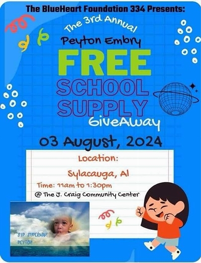 Meanwhile, the third annual Payton Embry Free School Supply Give-Away will be held at the J. Craig Smith Community Center from 11:00 a.m. to 1:30 p.m. It’s hosted by the BlueHeart Foundation 334.