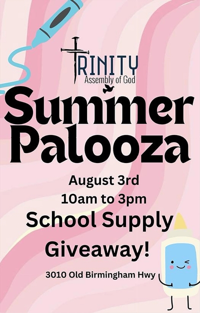 Trinity Assembly of God, located at 3010 Old Birmingham Hwy, will host a “Summer Palooza” from 10:00 a.m. to 3:00 p.m.