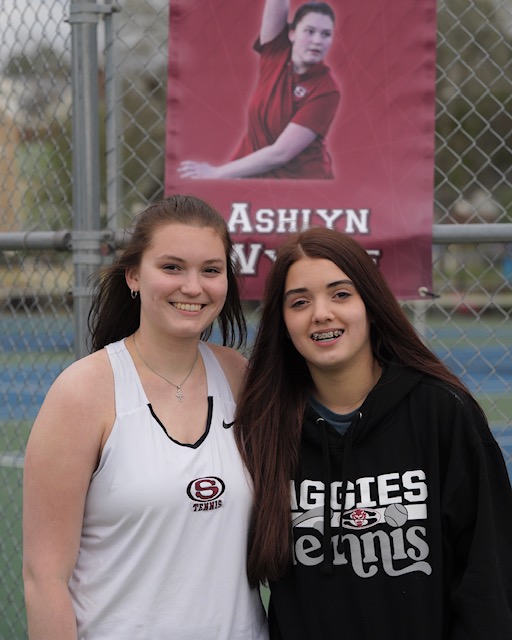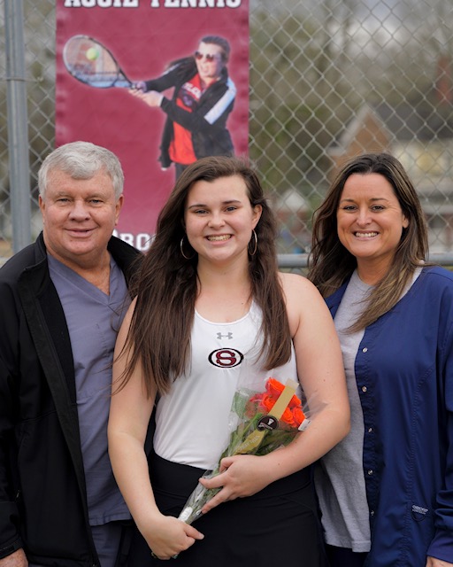 Both teams celebrated 9-0 victories. The Aggies have 4 seniors on the team this year, with all four being in the top six. The seniors are Ashlyn Wykoff, Brooke Gordon, Janie Poe and Colby Williams. Ashlyn Wykoff plays number 4 singles and 3 doubles and has been a varsity player for 5 years. Brooke Gordon plays number 5 singles and 2 doubles and has been a varsity player for four years. Janie Poe plays number 6 singles and is working on her first year letter as a varsity player. Colby Williams plays number 2 singles and 1 doubles and has been a varsity player for 4 years. Each of these seniors are an important part of the team and have helped lead the Aggies this season. The Aggies honored their seniors with an individual banner showcasing an action shot from the season. The players had pictures with families in front of their banners and a wonderful catered dinner from Chick-fil-A.