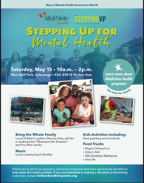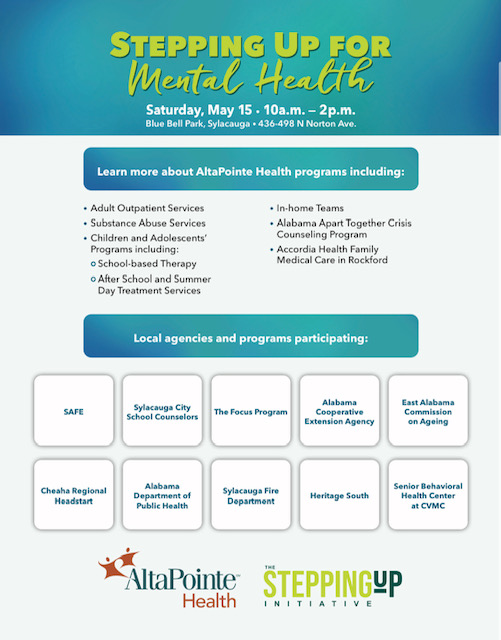 SYLACAUGA, Ala. – AltaPointe Health is hosting a “Stepping Up for Mental Health” event on Saturday, May 15, from 10 a.m. to 2 p.m. at Blue Bell Park in Sylacauga.