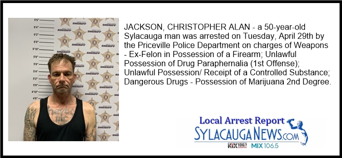 PRICEVILLE, Ala. – After a Sunday arrest of three Sylacauga men, the Priceville Police Department reports that yet another Sylacauga man has been arrested in their jursdiction on gun and drug charges, this time on Tuesday evening, April 29.