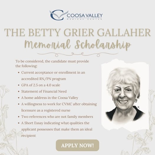SYLACAUGA, Ala. – The Betty Grier Gallaher Memorial Scholarship was created in loving memory of one nurse who dedicated over four decades of her career to caring for patients and team members at Coosa Valley Medical Center.