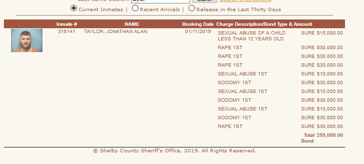 The Shelby County Sheriff’s Office on Friday arrested Jonathon Alan Taylor on 11 felony sex crimes, according to court records made public Monday. Taylor, 29, is charged with four counts of sex abuse of a child under age 12, four counts of first-degree rape and three counts of sodomy.