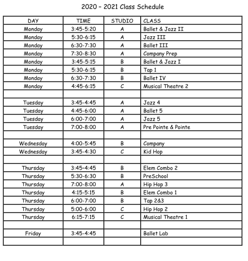 Classes are offered in ballet, pointe, jazz, tap, lyrical, hip-hop, musical theatre, and art.