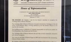TALLADEGA, Ala. – Mike Rogers came to the Hall of Heroes in Talladega to present a congressional record to honor the efforts of the museum staff who recognize and honor the local veterans.