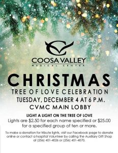 SYLACAUGA, Ala. – Coosa Valley Medical Center’s annual Christmas Tree Lighting and Tree of Love Celebration will be held next week.