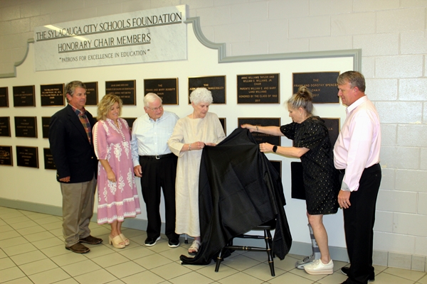 SYLACAUGA, Ala. – The Sylacauga City Schools Foundation presented its 70th Chair this week, honoring the Hodges family. Don and Lynn Hodges were surrounded by a host of family members as the chair and plaque were unveiled in the Sylacauga High School foyer.