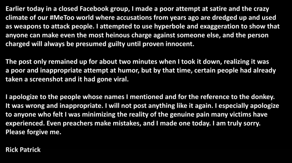 Patrick issued an apology on the First Baptist Church of Sylacauga Facebook group this afternoon.
