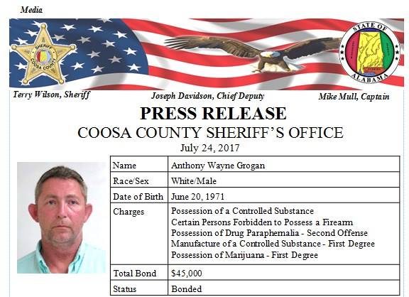 Officers transported Grogan to the Coosa County Jail where he wass charged with, Possession of a Controlled Substance, Certain Persons Forbidden to Possess a Firearm, Possession of Drug Paraphernalia Second Offense, Manufacture of a Controlled Substance First Degree and Possession of Marijuana First Degree.