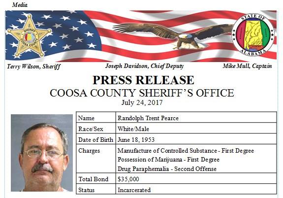 According to the Coosa Co. Sheriff’s Office, Randolph Trent Pearce, 64, was served a search warrant at his home on July 21 by deputies and officers from the Alabama Law Enforcement Agency.