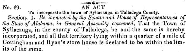 First established in 1834, this first incorporation as Syllacauga was followed by another in 1887 as Sylacauga. Over time, there have been many variant spellings including Suillacouga on 1838 maps and Syllacoga.