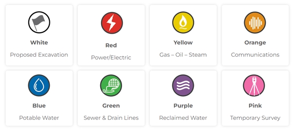 There’s also the matter of knowing how to avoid creating a leak. Since natural gas and so many other utilities are located underground, state law requires you to CALL 811 at least 48-hours before any project that requires digging. Line markers will identify, by service-specific colors, where those utilities are located. See the Color Codes below: