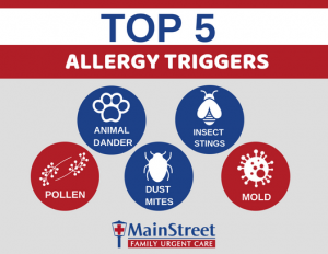 Many of these symptoms can be treated after being evaluated by a MainStreet Family Urgent Care provider who can then decide the best way to treat those symptoms and get you back to enjoying the warm weather. Treatment options include nasal corticosteroids, injected corticosteroids or extra-strength allergy pills, some of which can be purchased on-site with MainStreet’s Pre-Pak pharmacy, which eliminates the need for an extra trip to the pharmacy.
