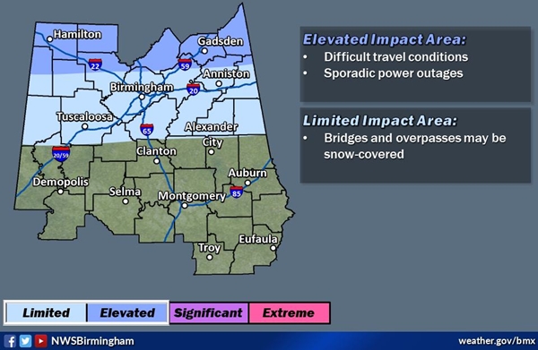 The graphic is an indication of what is expected, but the Weather Service warns that a two to three degree temperature change in the forecast can mean significant changes one way or the other in the expected impacts. Timing is also a major factor in determining the local impact of Winter weather on travel.