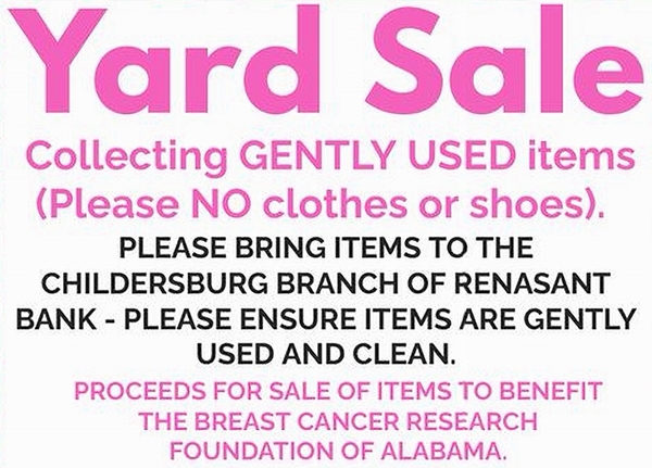 You’ll be asked to bring along gently-used items – no clothes or shoes that will be a part of their Indoor Yard Sale to be held the entire week of Oct. 21-25 at the downtown Childersburg branch, located at 120 8th Ave. SW.