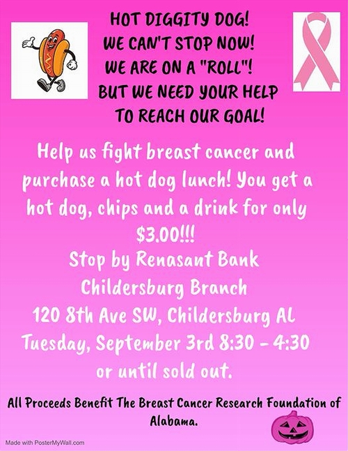 CHILDERSBURG, Ala. – October is Breast Cancer Awareness Month, but the effort to raise funds for the Breast Cancer Research Foundation is starting before that for Childersburg’s Renasant Bank branch.