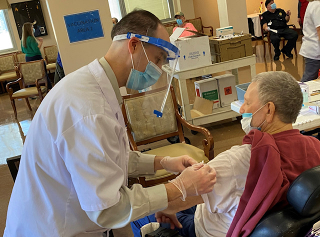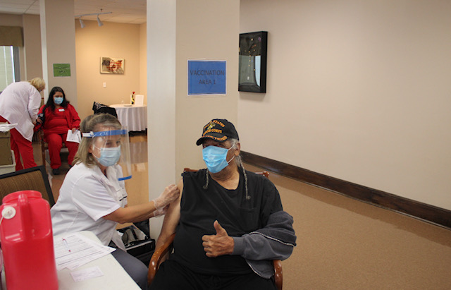 Marine Corps veteran, Otis Shealey, was the first among 468 veterans who reside at the state’s four veterans homes to receive the vaccine. Giving a “thumbs-up” after receiving the vaccine, Shealy said “I feel great after taking the vaccine and I’m proud to aid in the fight against the virus.”