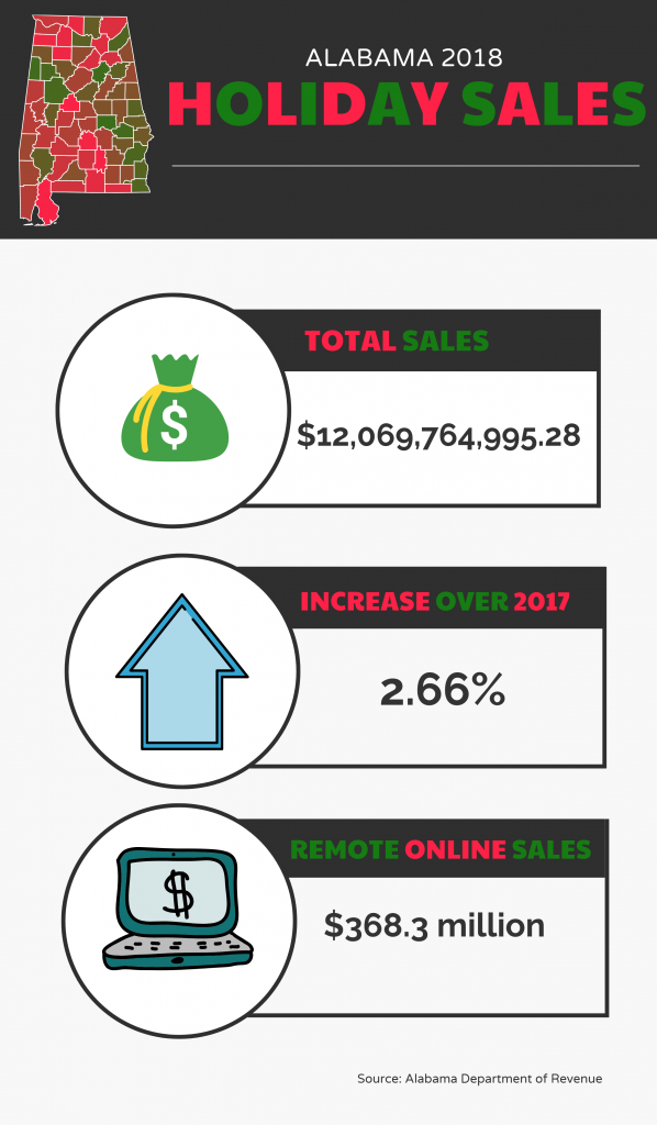 The Alabama Retail Association said final figures from the Alabama Department of Revenue confirm that 2018 holiday sales in Alabama set a record and topped $12 billion for the first time.