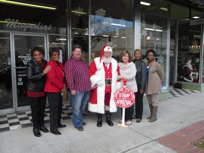 Magnolias Gift Shop, 125 North Broadway Avenue. Pictured: Sylacauga Beautification Council members Janice Adams, Lucille Anderson, and Dawn Stevens; Santa Claus; Linda Hardy of Magnolias; and SBC members Glenda Gaines and Lisa McNealey.