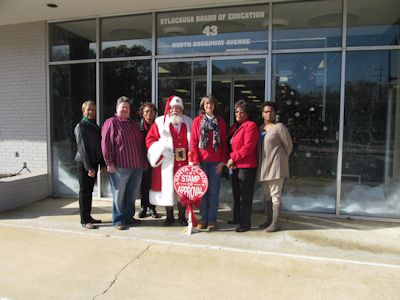 Sylacauga Board of Education, 43 North Broadway Avenue. Pictured: Sylacauga Beautification Council members Glenda Gaines, Dawn Stephens, and Janice Adams; Santa Claus; Kelley Wassermann for the Sylacauga Board of Education; and SBC members Lucille Anderson and Lisa McNealey.